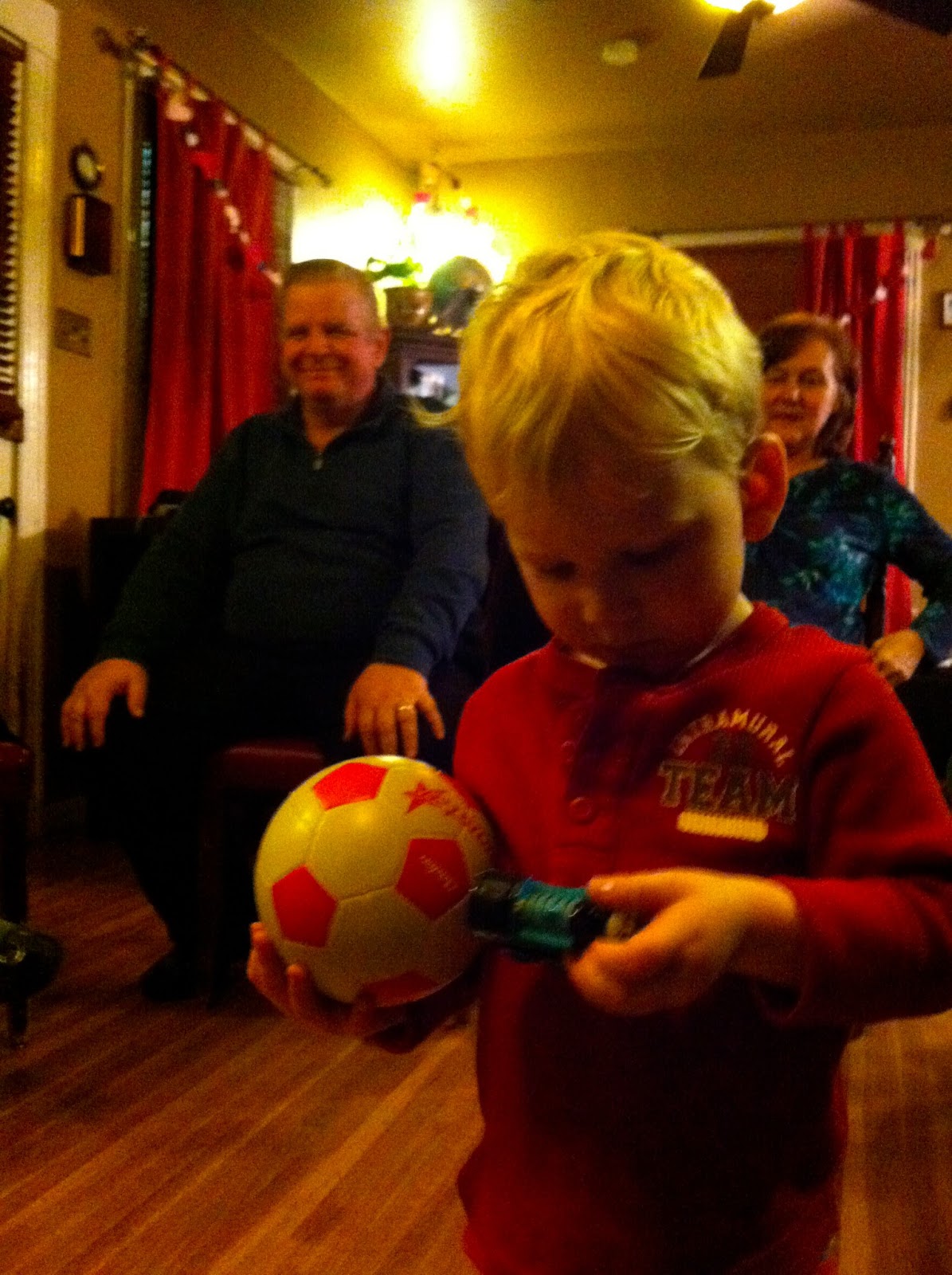 | A soccer ball from Uncle Jimmy and Aunt Jessica and Thomas from Gramps and Grams--he's happy as can be! |